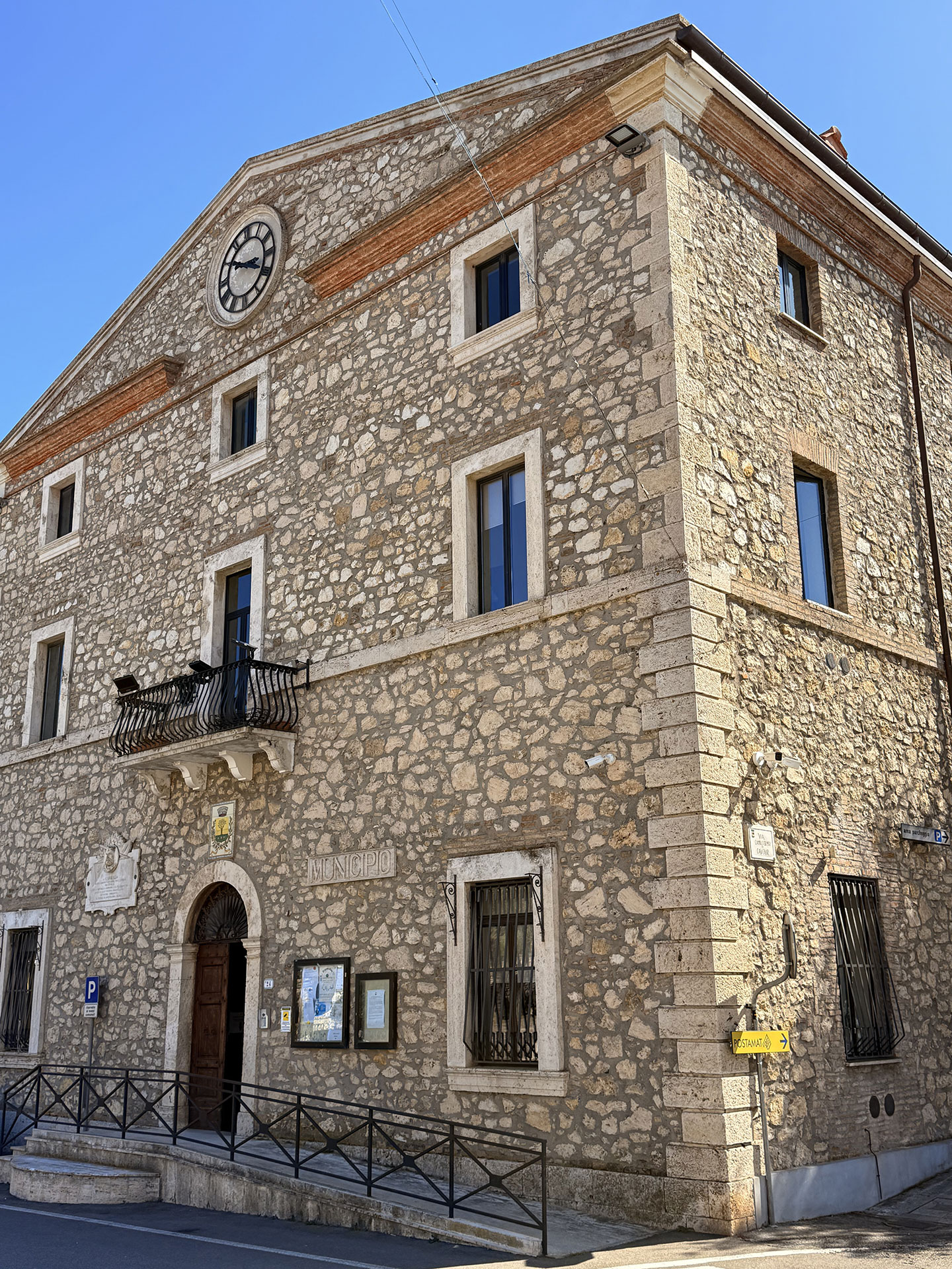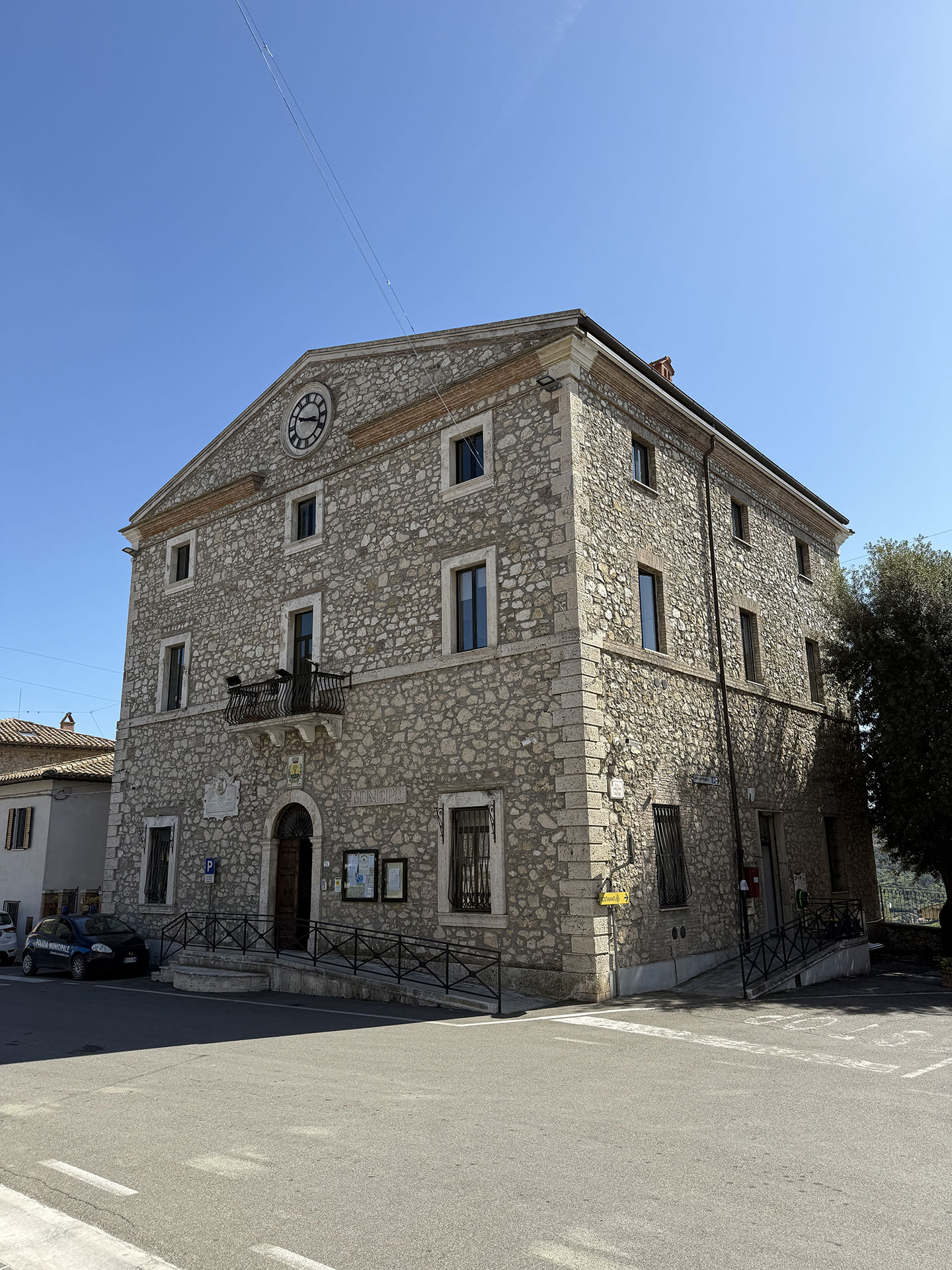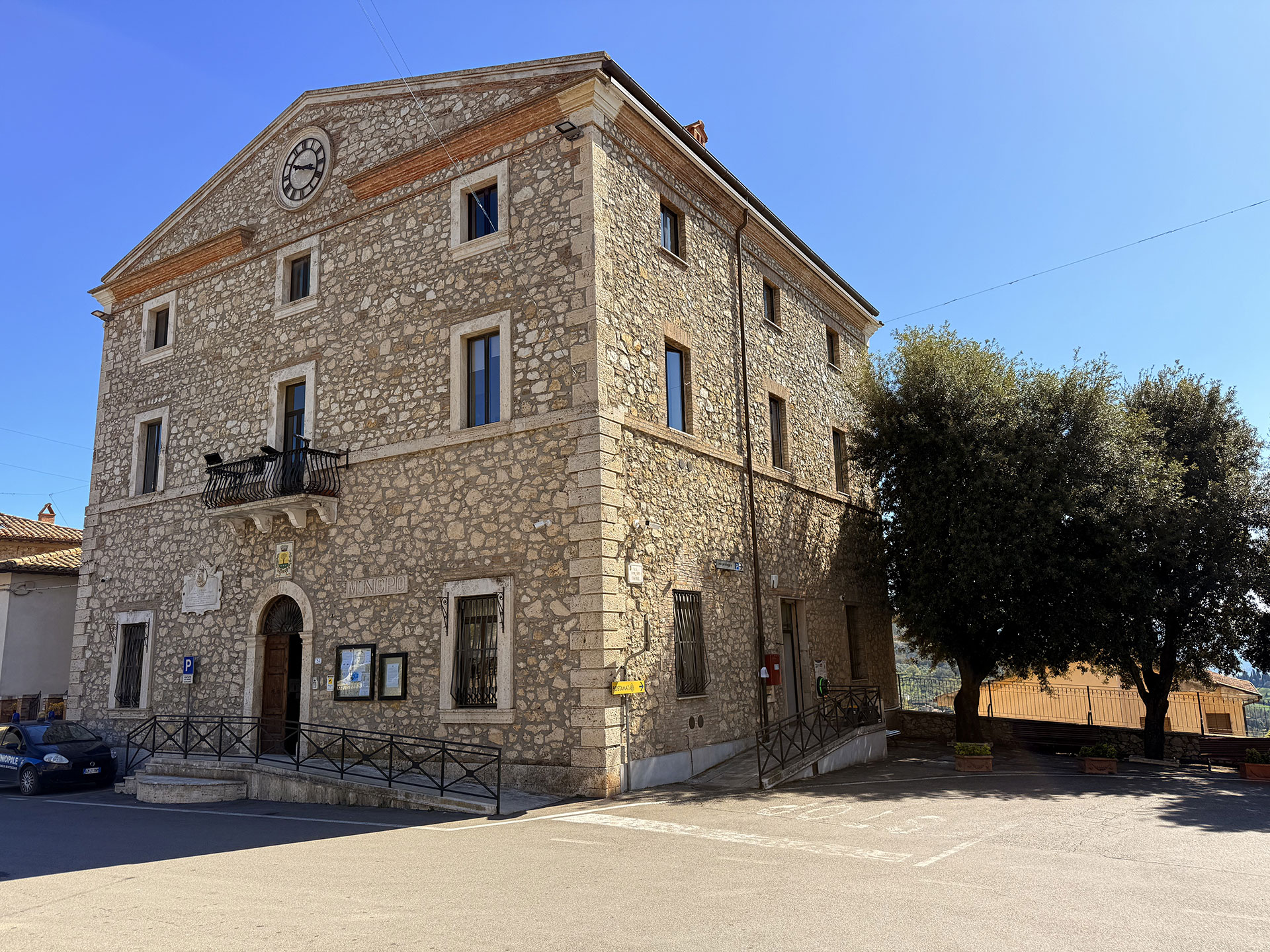 Il Palazzo Comunale di Montecchio, affacciato su Piazza Garibaldi, custodisce la vita civica del paese: una facciata severa, il medaglione dedicato a Garibaldi e, tutt’intorno, il respiro del centro storico che sale verso il castello.