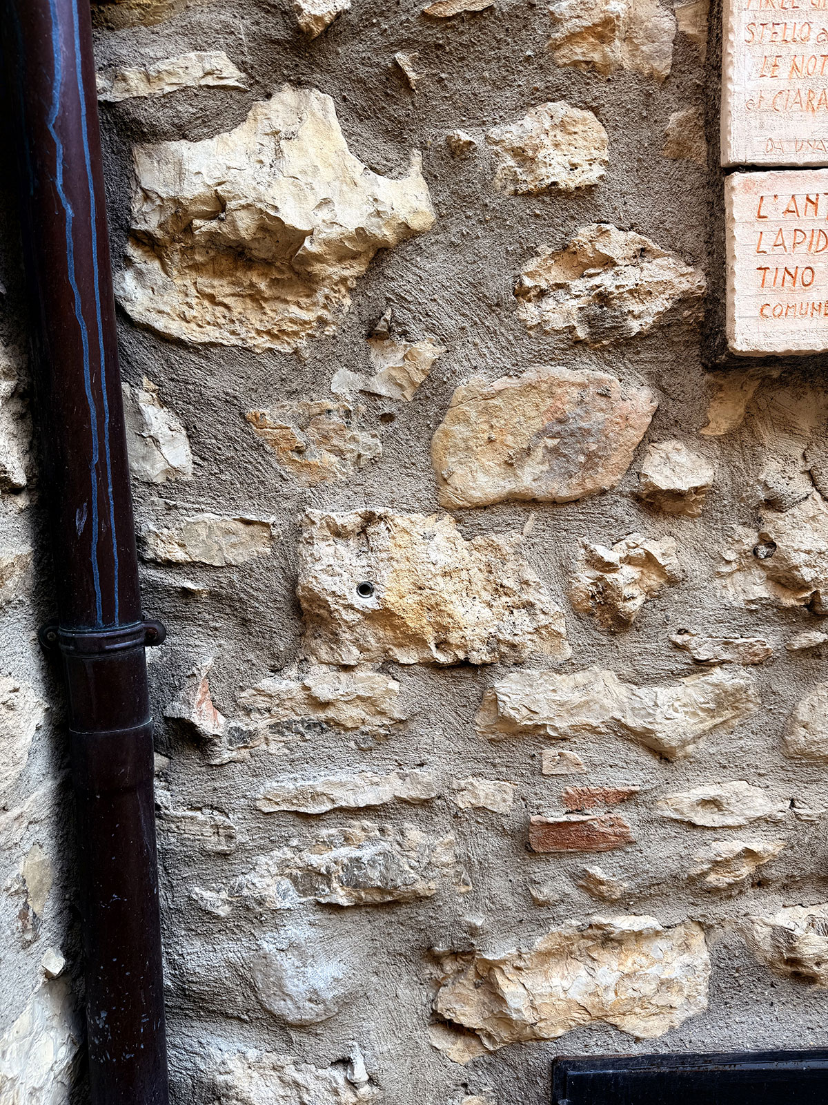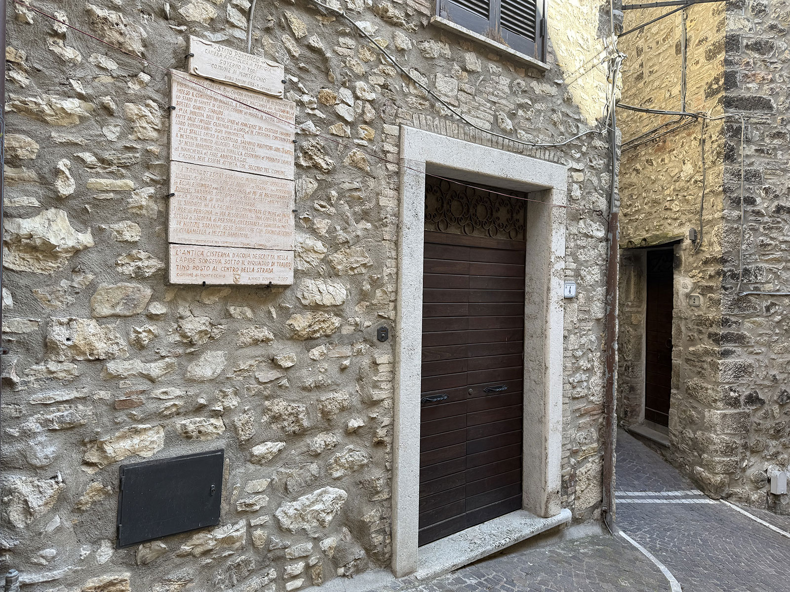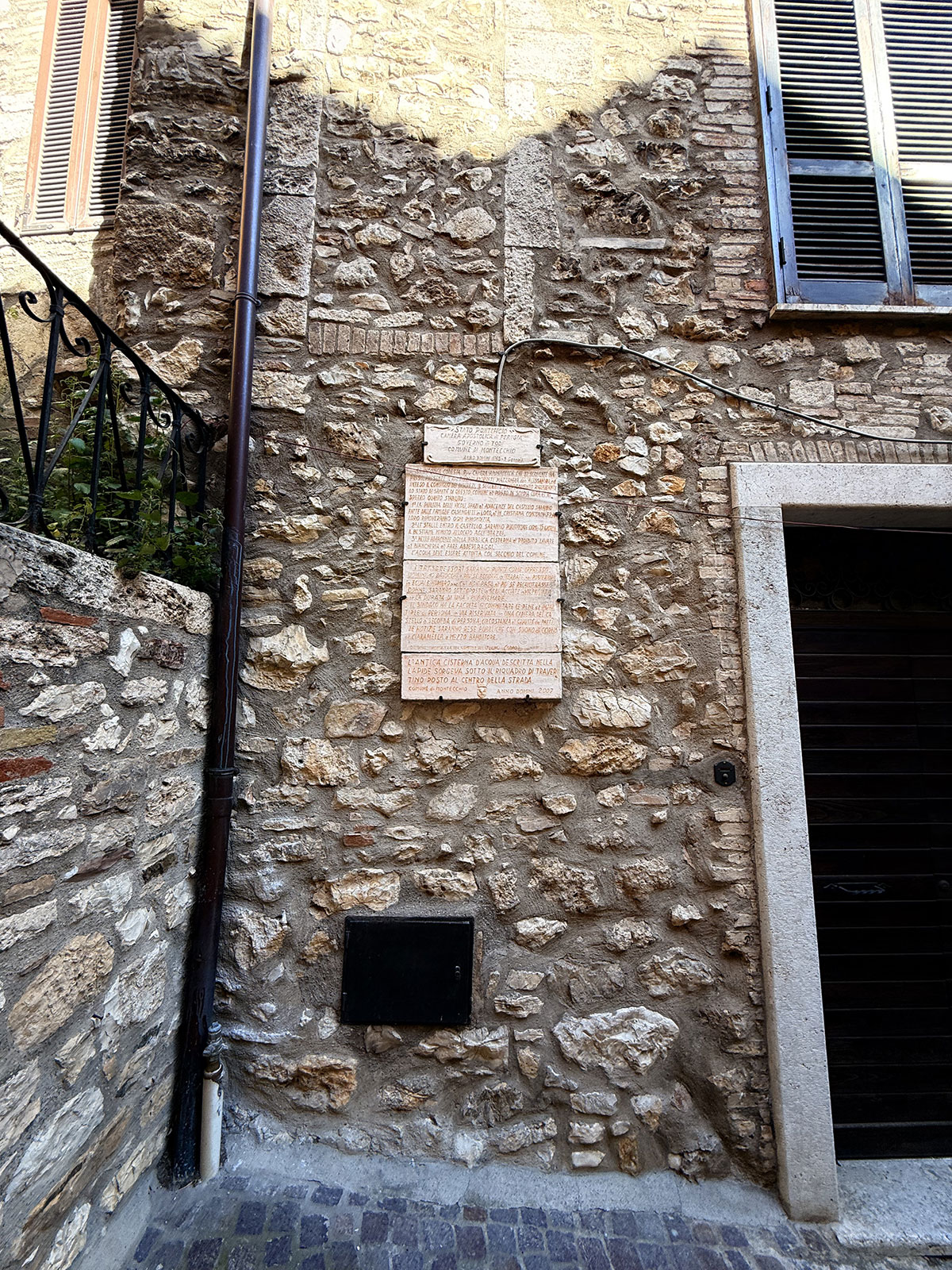 Subito dopo La Torre, sulla destra in salita, un riquadro in travertino nel selciato indica la cisterna comunale; di lato – sulla destra – una epigrafe tramanda l’ordinanza del 1748 passata alla memoria come Tavola delle Punizioni: poche righe che raccontano, senza giri di parole, come si proteggevano igiene, decoro e soprattutto l’acqua del castello.