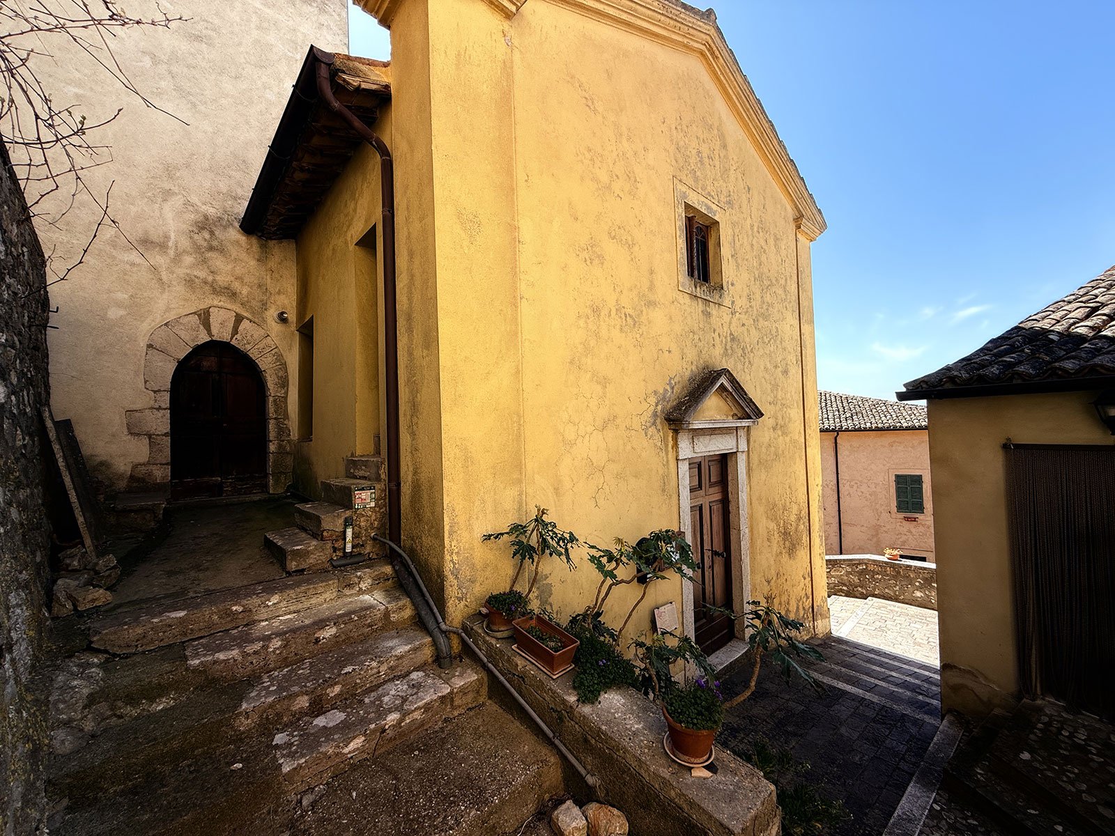 All’esterno, la facciata a due spioventi è ordinata e luminosa: un portale con cornice in travertino e timpano triangolare è sormontato da una finestra rettangolare; sul retro si alza il campanile a vela con tre campane. La copertura in coppi e sottocoppi poggia su due capriate principali con limette e pianellato laterizio, a ribadire l’essenzialità costruttiva del luogo.