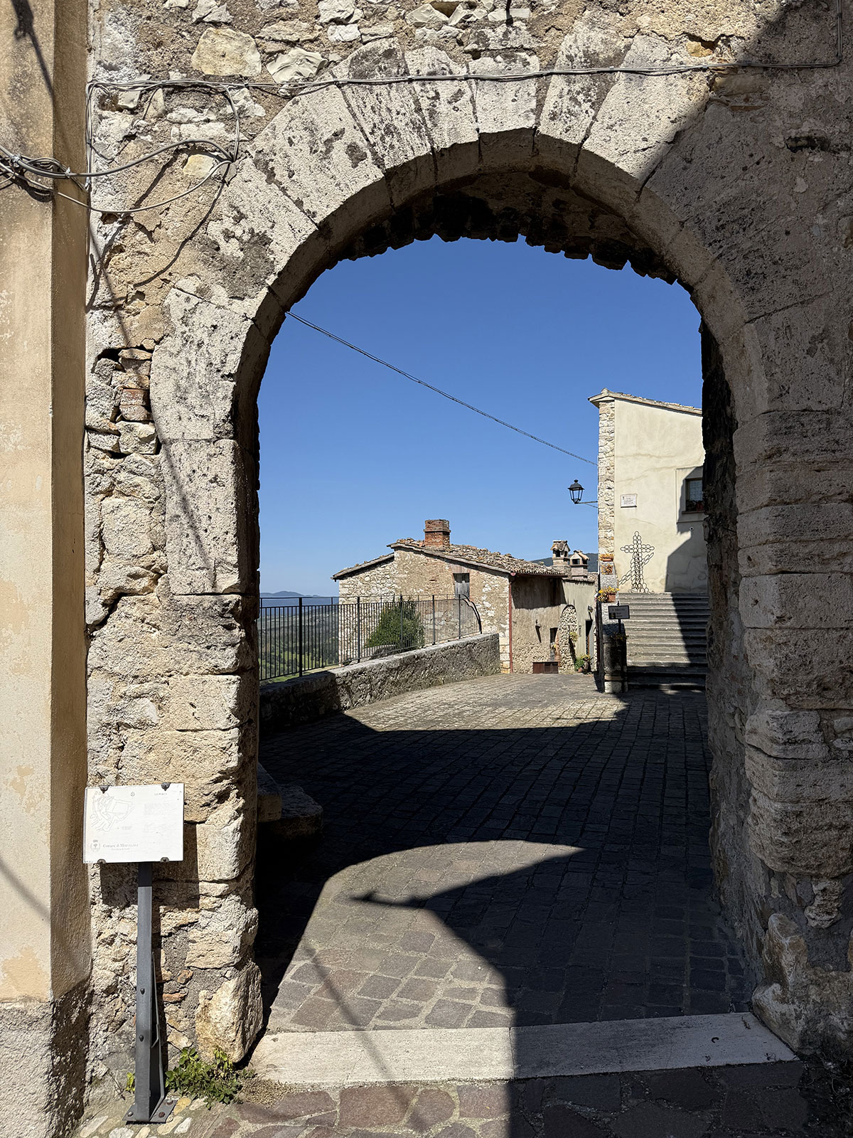 Attraversarla vuol dire entrare nel cuore dell’abitato: dietro l’arco si aprono scalinate, panorami e la vista sulla massa compatta e altera di Palazzo Ancajani.